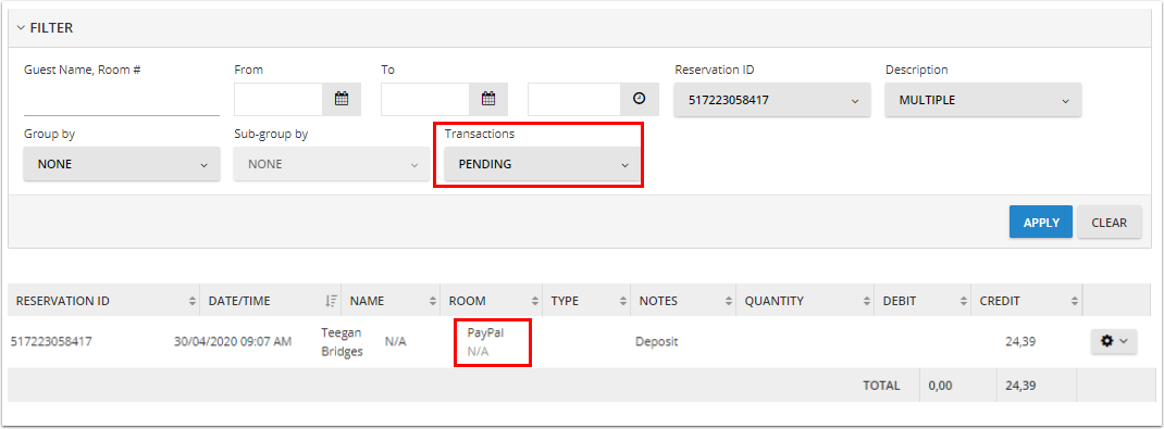 - Cloudbeds PMS hesabında, işlem ancak İşlemler filtresinde Beklemede seçeneğini işaretlersen Folyo'da görüntülenir.