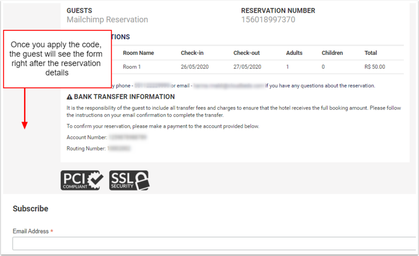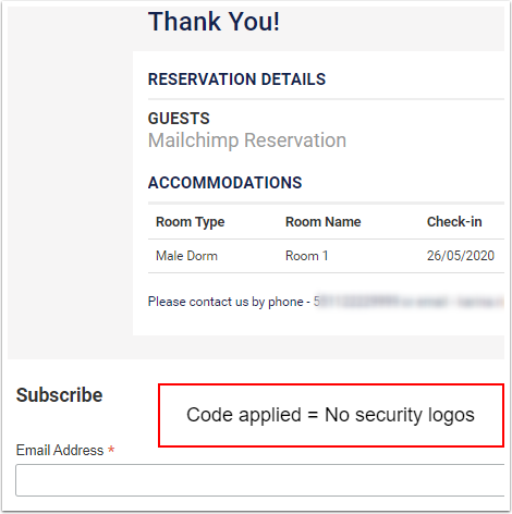 Mailchimp kayıt formu yalnızca rezervasyonun en sonunda, tüm rezervasyon bilgilerini gösteren onay sayfasına eklenebilir.