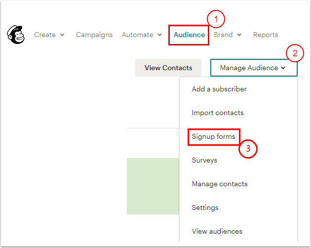 - Mailchimp hesabına giriş yap ve Audience sekmesine git
