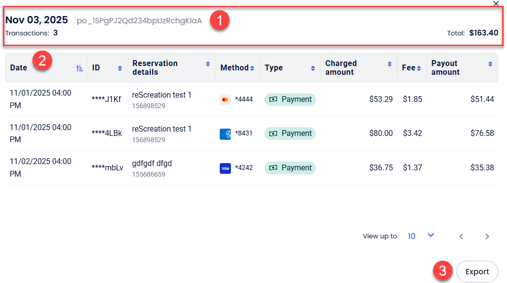- Dışa Aktarma düğmesi: Kullanıcının bu özel ödeme çıkışı için tam ve detaylı işlem listesini, genellikle bir elektronik tablo olarak, muhasebe yazılımıyla kolay mutabakat için indirmesine olanak tanır.