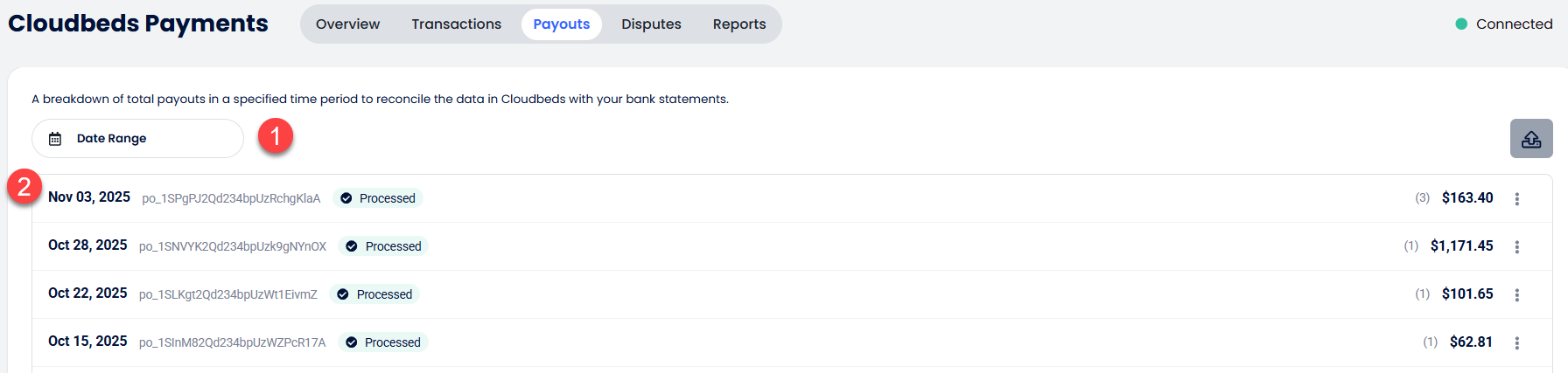 Ödeme Çıkışları Raporu, Üye İşyerlerine Cloudbeds Payments kullanarak para yatırma bilgileri ve Mutabakat sağlamada yardımcı olur. Aşağıdaki adımları takip ederek erişebilir ve kullanabilirsin: