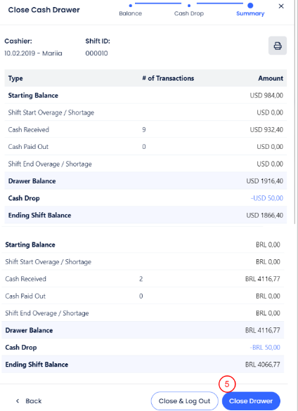 Kapalı olan herhangi bir kasa çekmecesi, Kasiyer Raporunda bulunabilir. Tüm para birimlerinde beklenen açılış ve kapanış bakiyesini, açılış ve kapanış nakit bakiyesini, alınan tutarı ve kasa teslimini görebilirsin.