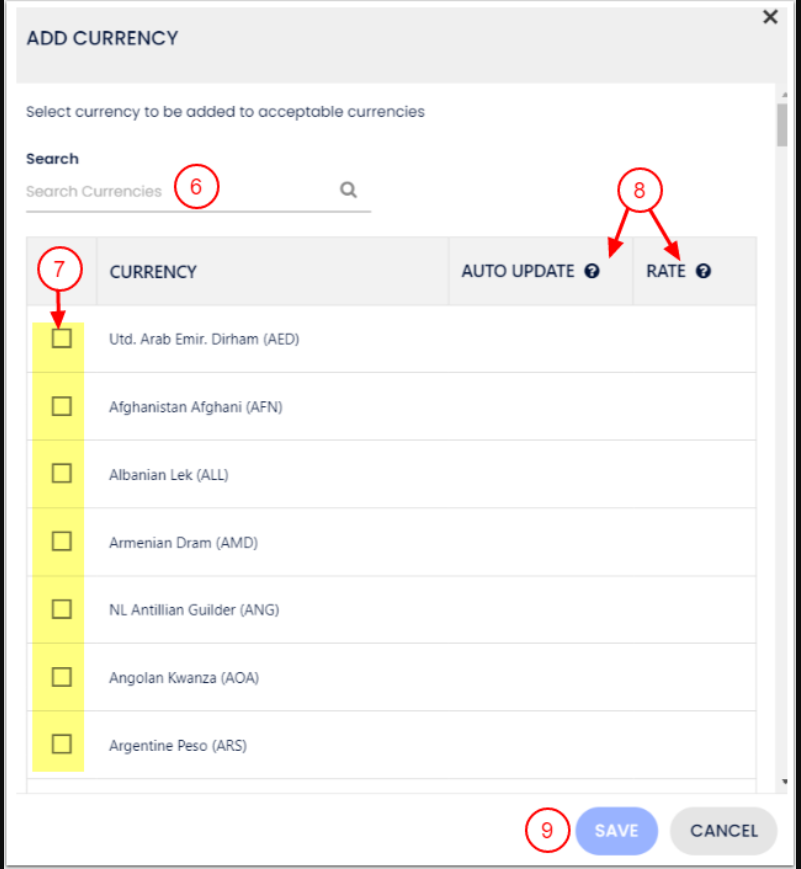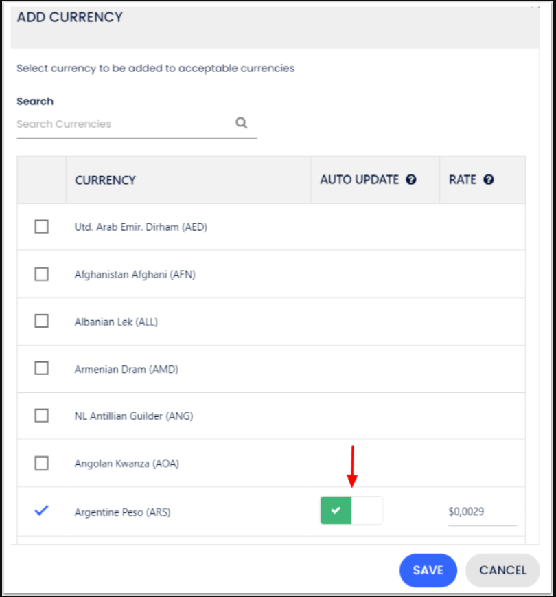 1. Para birimlerini etkinleştirmeyi kolaylaştırmak için, para birimi panelinin üstündeki arama çubuğunu kullanarak para birimi adlarını veya kodlarını kolayca arayabilirsin.