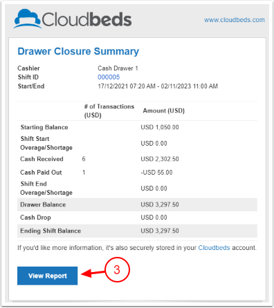 - Sistemde Sistem Tercihleri içinde alıcı olarak ayarlanmış kullanıcılar, kasa kapatıldıktan sonra Kasa Kapatma Özeti içeren bir e-posta alacaklar. Raporu Görüntüle seçeneğine tıkladığında sistem seni Kasiyer Raporu sayfasına otomatik olarak yönlendirecek: