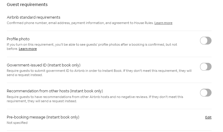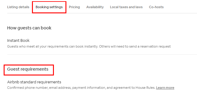 Anında Rezervasyon özelliği otomatik açılacağı için, Airbnb extranetinde listelemelerini düzenlerken Rezervasyon Ayarları altında misafir gereksinimlerini hâlâ düzenleyebilirsin: