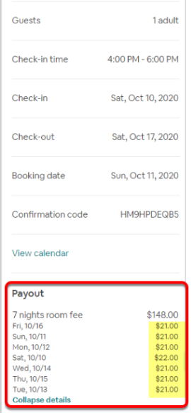Airbnb toplamı gece sayısına böldü, misafir için daha cazip görünmesi adına farklı gösterdi ($21.00/gece) ve toplam $148.00 olarak yuvarlandı, aşağıdaki gibi: