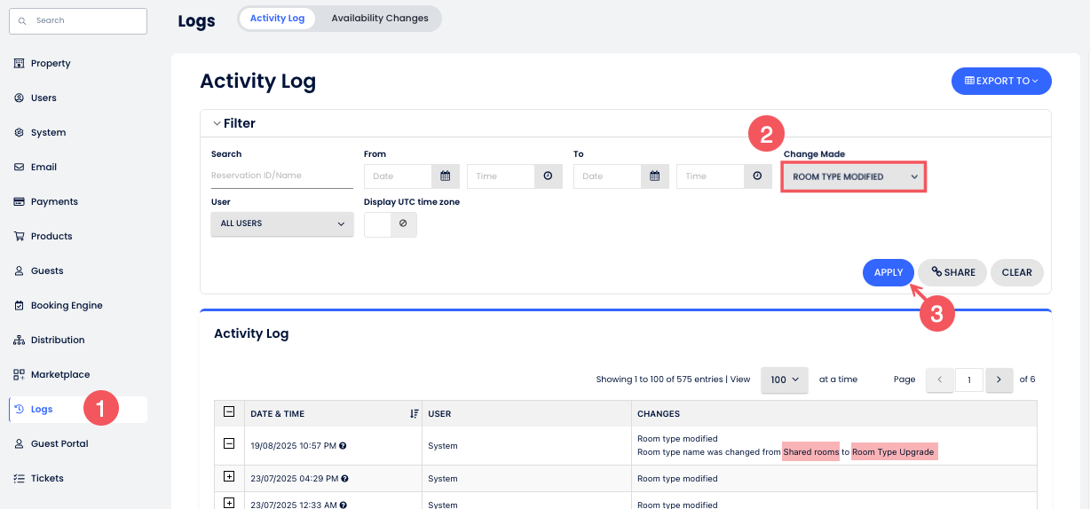 - UYGULAya tıkla. “Oda tipi adı X’den Y’ye değiştirildi” gibi kayıtları tarih/saat ve kullanıcı ile ara.