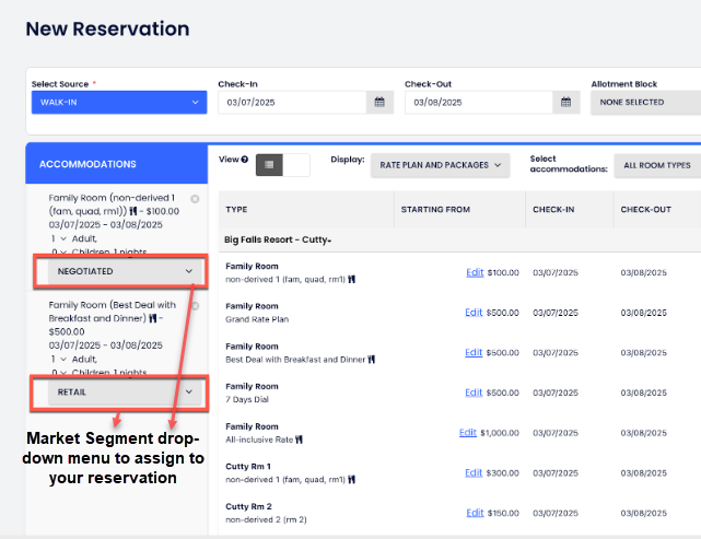 - Kullanıcılar, rezervasyondaki her konaklama için pazar segmentini seçebilir veya geçersiz kılabilir.
