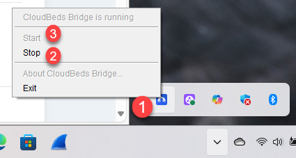 - Windows sistem tepsisinde (genellikle ekranının sağ alt köşesinde) Cloudbeds Bridge Uygulaması simgesine sağ tıkla.