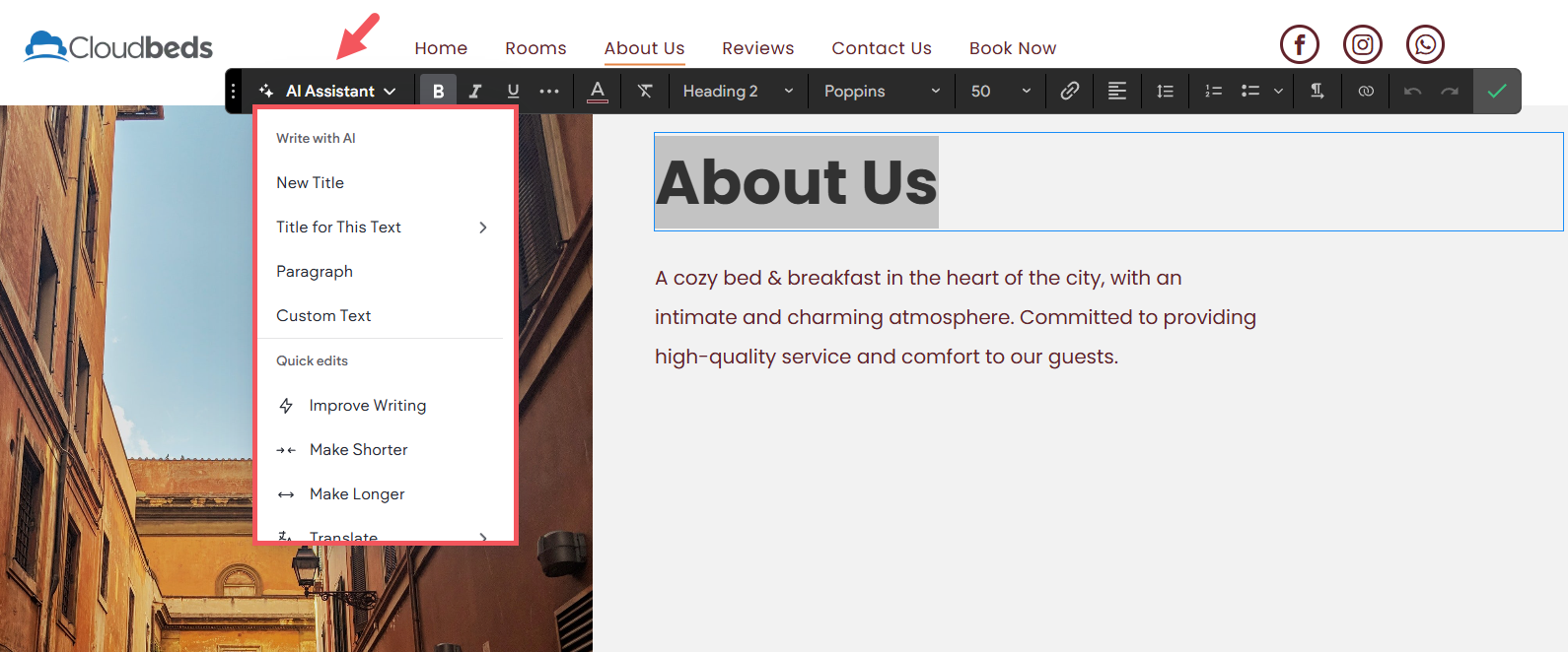 Cloudbeds Websites AI (yapay zeka) Asistanı, Cloudbeds Website editörüne entegre edilmiş, web sitenizin içeriğini yazmanıza, geliştirmenize ve optimize etmenize yardımcı olan bir araçtır. Sayfa bölümleri, metin veya SEO için hızlıca düzgün bir ilk taslak oluşturur; ardından bunu düzenleyerek değerli zaman kazanabilirsiniz.