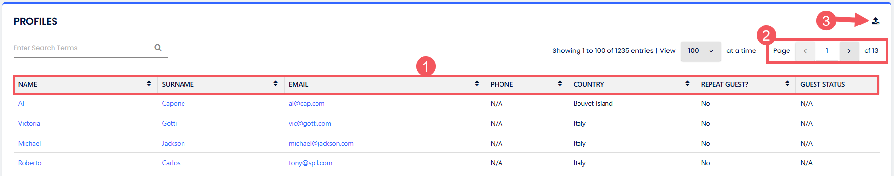 - Sayfa navigasyonu - Uygulanan filtrelere göre misafirlerin tam listesini görüntülemek için