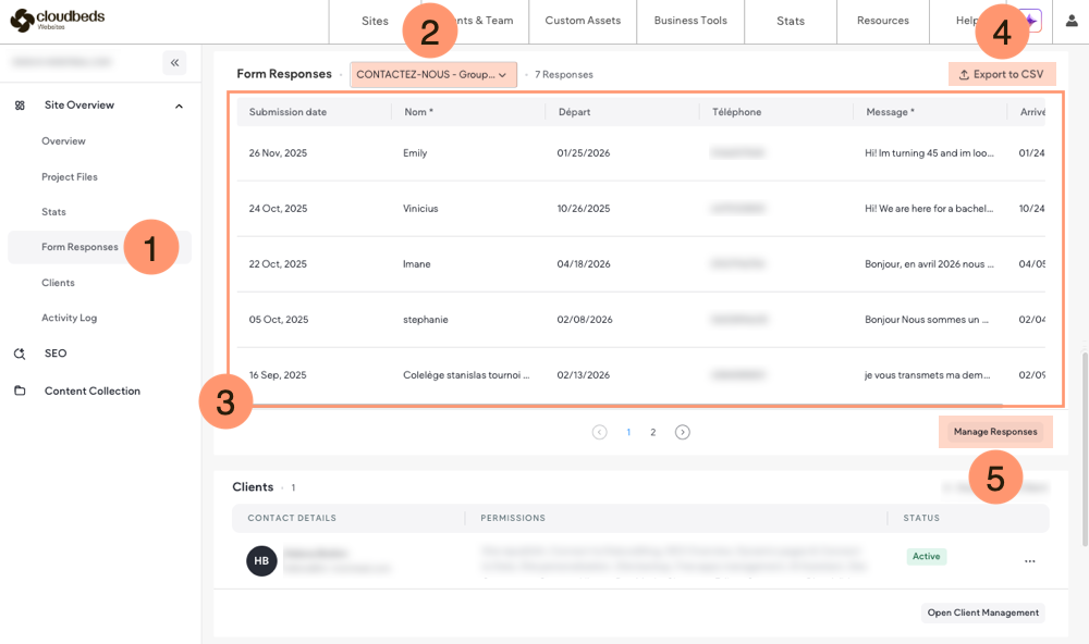 Misafirlerin geri dönüş yapabilmesi için web sitende bir iletişim formu kullanabilirsin. Tüm gönderimler tesis e-postana iletilecektir. Ayrıca, yanıtları dışa aktarabilir ve platformda yönetebilirsin.