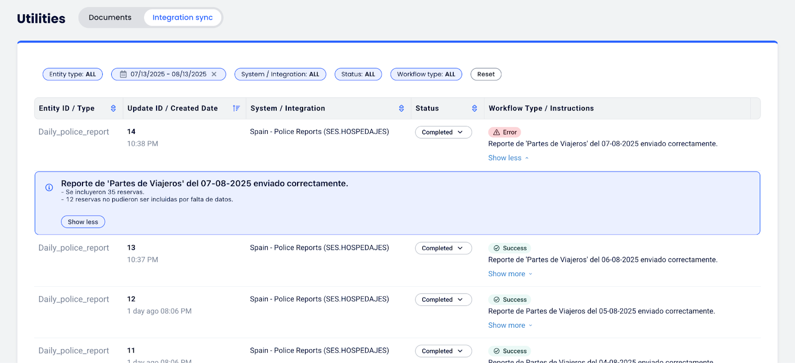 - Carga Masiva: düzeltmeler, 01:00’de oluşturulan ve Yardımcı Programlar → Belgeler bölümüne yerleştirilen bir sonraki günlük dışa aktarımda yansıtılır. Yeniden oluşturulan dosyaları SES.HOSPEDAJES portalına yüklemen gerekir.