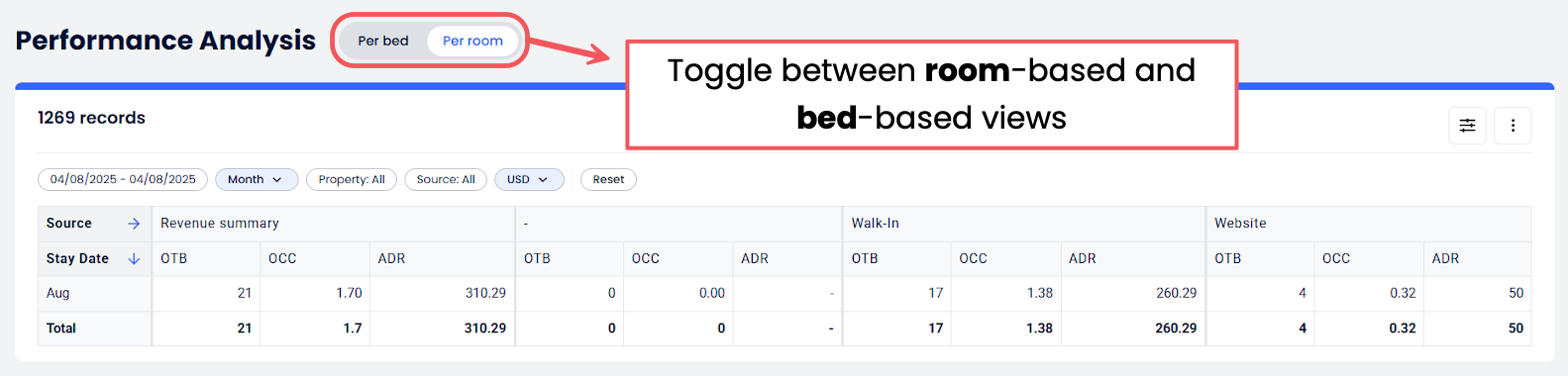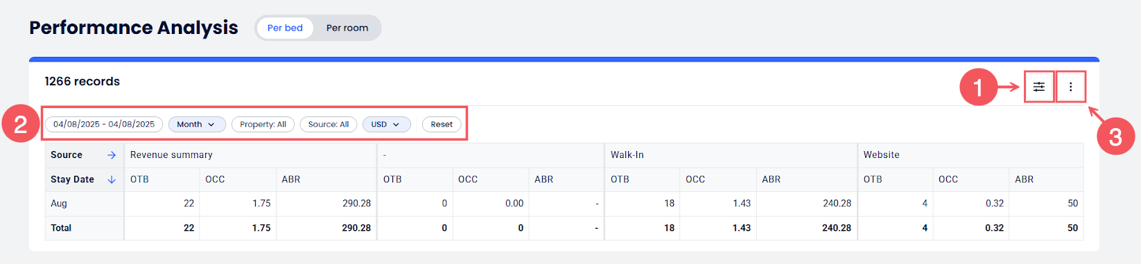 Performans Analizi Raporu, gelir ve doluluk metriklerini bir araya getirir, böylece tesisinin performansını rezervasyon kaynağı bazında değerlendirebilir ve oda doluluğu ile yatak doluluğu (karma otel/hostel işletmeleri için) arasında hızlıca geçiş yapabilirsin. Ayrıca çoklu tesis analizini, para birimi dönüşümünü ve PDF/CSV/Excel formatlarında dışa aktarmayı destekler.