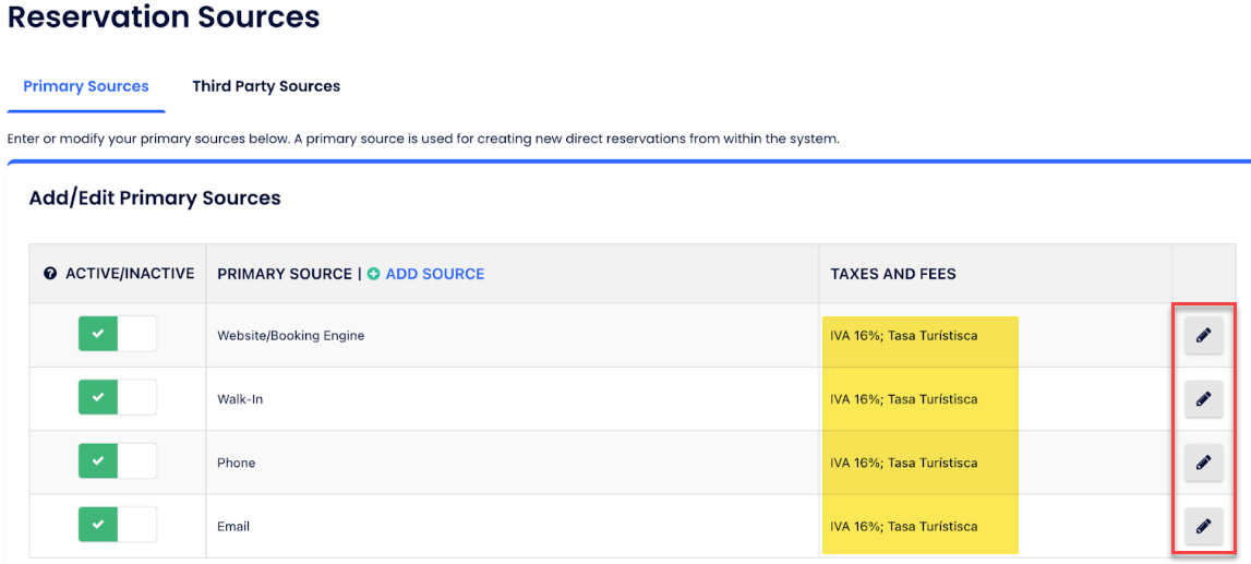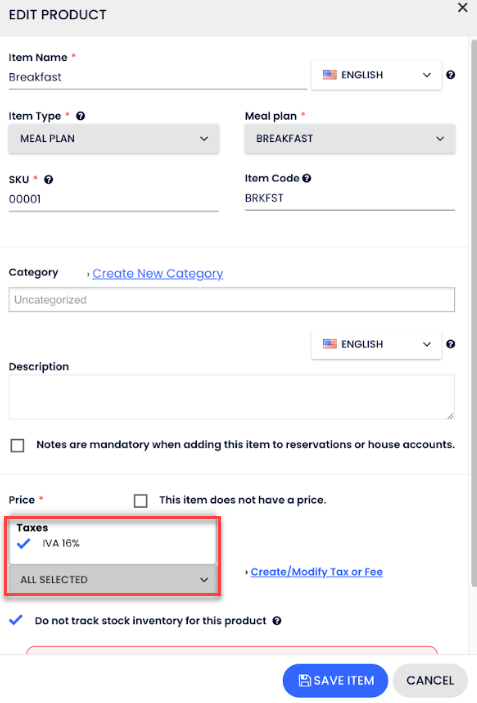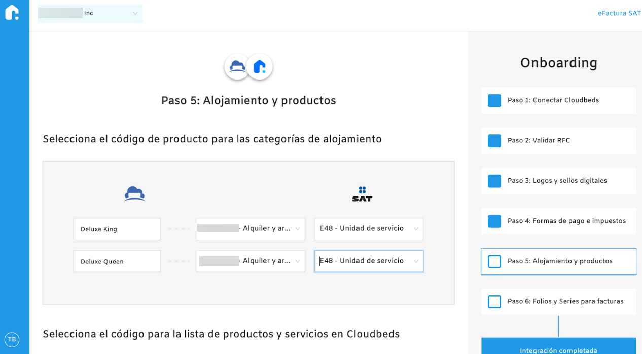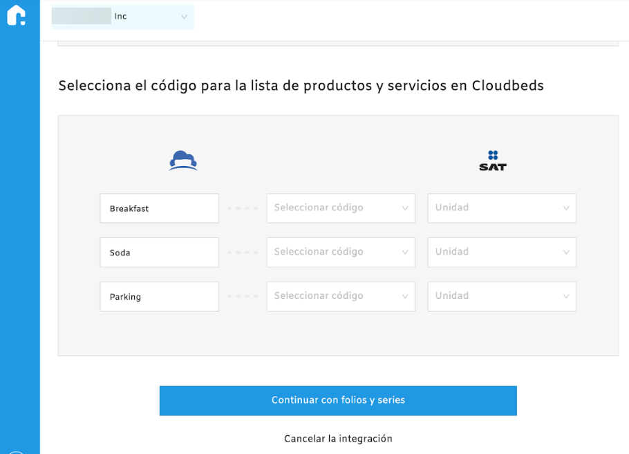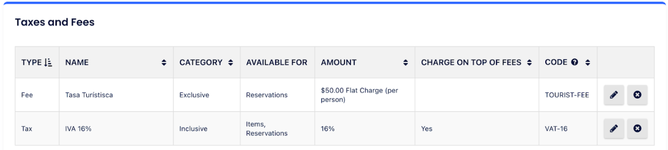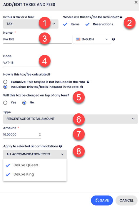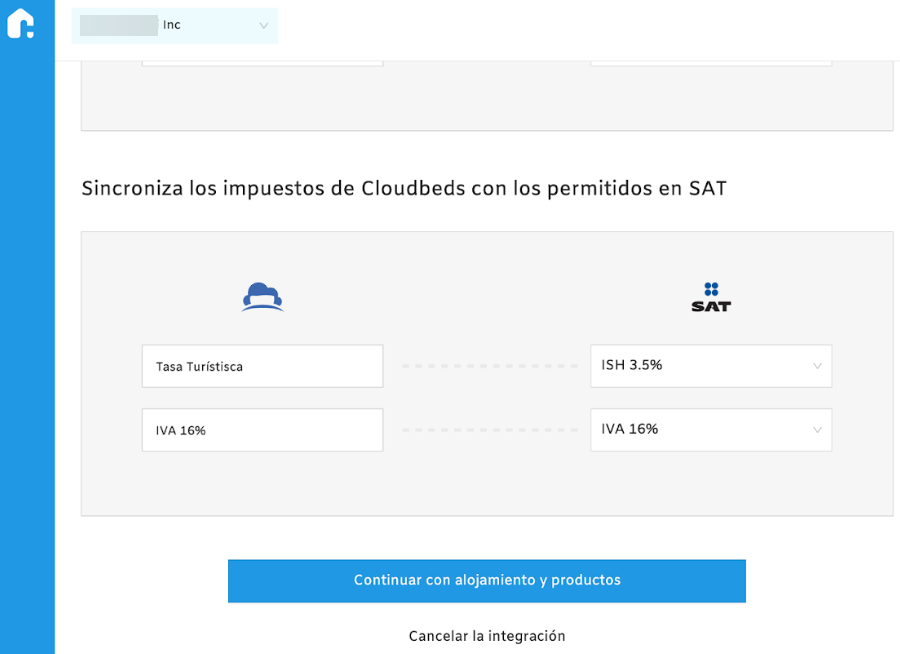 - Vergiler bölümüne inin ve Cloudbeds üzerinde yapılandırılan vergiler ve ücretleri, yerel düzenlemelere göre SAT tarafından izin verilen vergiler ve ücretlerle eşleştirin.