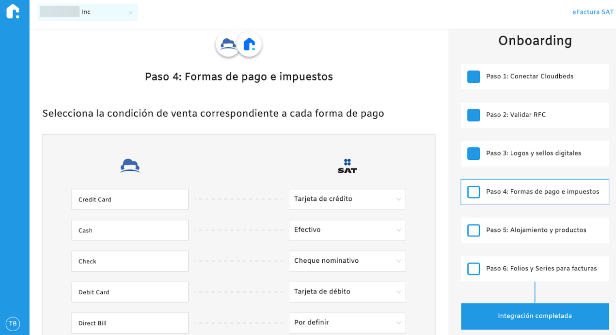 Cloudbeds üzerinde yapılandırılan ödeme yöntemlerini, yerel düzenlemelere göre SAT’ın ödeme yöntemleriyle eşleştirin.