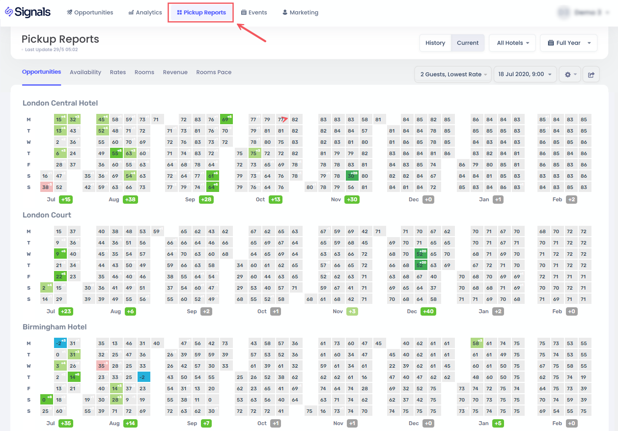 - Oda Pace – Mevcut pickup’ı geçen yılın aynı zamanıyla karşılaştırarak rezervasyon ivmesini ve boşlukları gösterir.