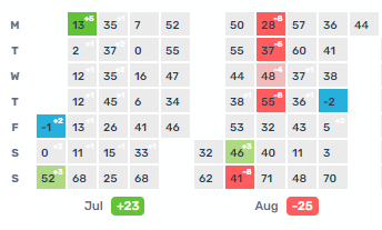 Bu görünümde, metriklerindeki farklı değişiklikleri göstermek için çeşitli renkleri hemen göreceksin; bu renkler ayrıca sağ üstte küçük sayılar olarak da gösterilir.