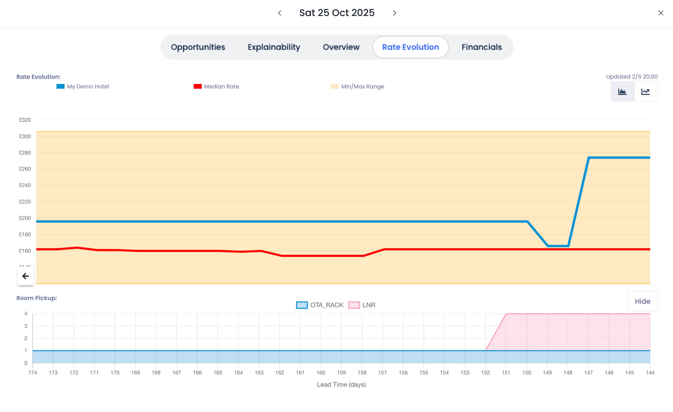 Fiyat Evrimi sekmesi, fiyatlandırma ve doluluk davranışının zaman içinde nasıl değiştiğini değerlendirmenize yardımcı olan görsel trend verileri sunar. Bu bilgi, bir fiyat önerisinin zamanında olup olmadığını veya düzeltme gerektirip gerektirmediğini doğrulamanıza yardımcı olur.