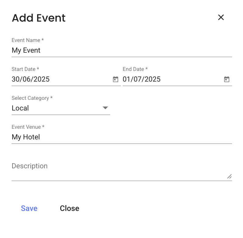Etkinlik Takvimi görünümünde Ekle Etkinlik butonuna (artı simgesi) tıkladığında, otel takvimin için özel bir etkinlik oluşturabilirsin: