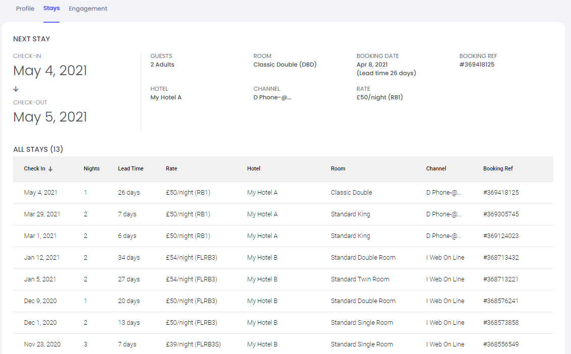 Konaklamalar sekmesi seçildiğinde, misafir profili içinde, misafirin tesis grubunuzdaki geçmiş ve gelecekteki tüm konaklamalarının tam kaydını bulabilirsin.
