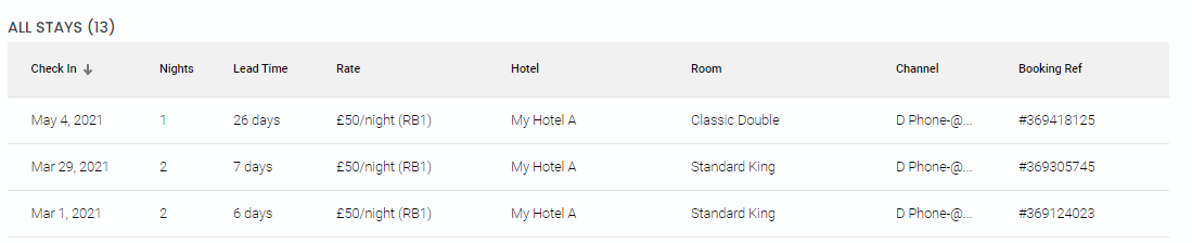 Burada, misafirin tüm rezervasyonlarının yer aldığı bir tablo bulunur ve ilgili tablo üst bilgisine tıklayarak sıralama yapabilirsin.