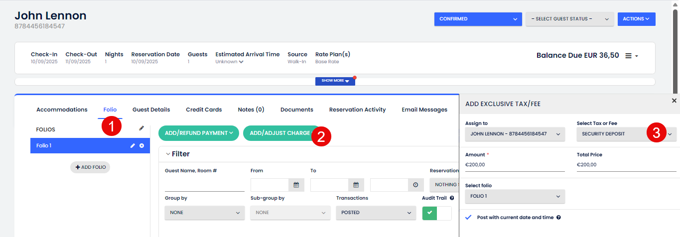 - Misafir giriş yapar → 200 € tutarında Depozito folyoya eklenir.