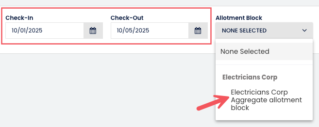Seçtiğin konaklama tarihleri tamamen normal bloklardan birinin içinde bile olsa (örneğin, 1–5 Ekim “Electricians Corp Hafta 1” içinde), açılır menüde Kontenjan Bloğu Toplamı seçeneği yine de görünür.