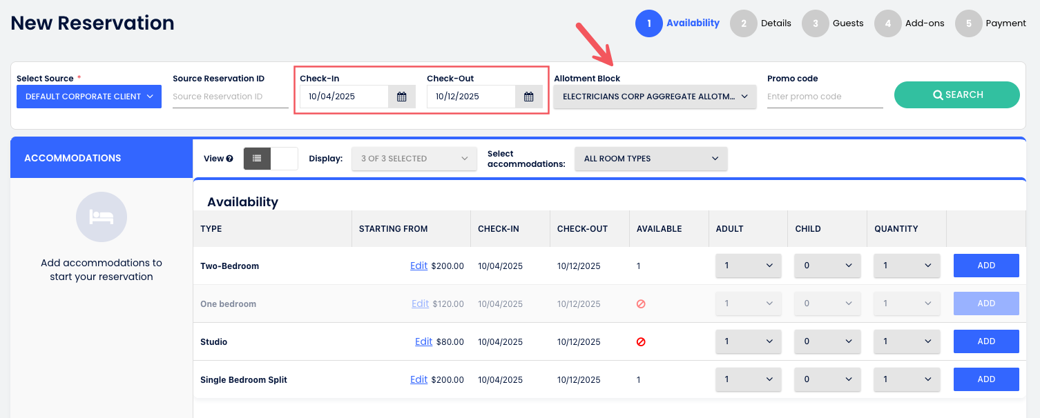 PMS, grubun altındaki tüm bloklarda müsaitliği kontrol eder ve sana tek bir kesintisiz rezervasyon oluşturma imkanı verir. Ardından, rezervasyon oluşturmanın normal adımlarına devam edebilirsin.