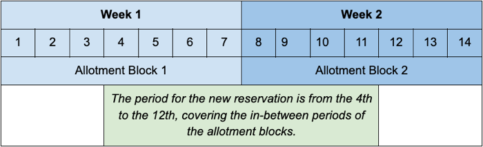 Rezervasyonlar kesinlikle kontenjan bloklarının tarih aralıkları içinde olmalıdır. İlk blok başlamadan önce veya son blok bittikten sonra ekstra günler topluluk üzerinden rezerve edilemez.