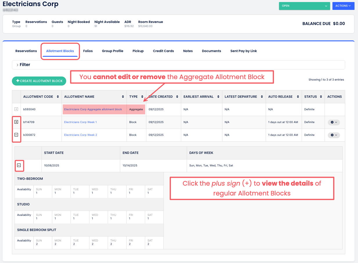 Etkinleştirildiğinde, PMS toplu blok ile normal kontenjan blokları arasındaki bağlantıyı otomatik olarak yönetir. Toplu Kontenjan Bloğu ile göreceğin ve etkileşimde bulunacağın birkaç yer vardır:
