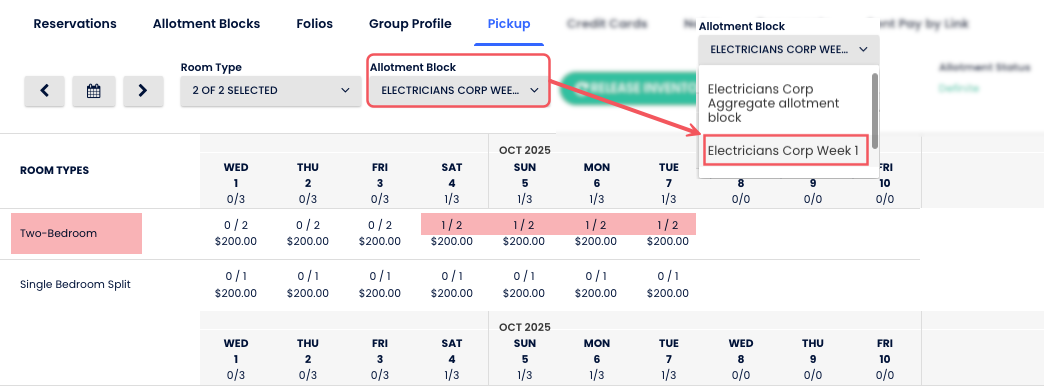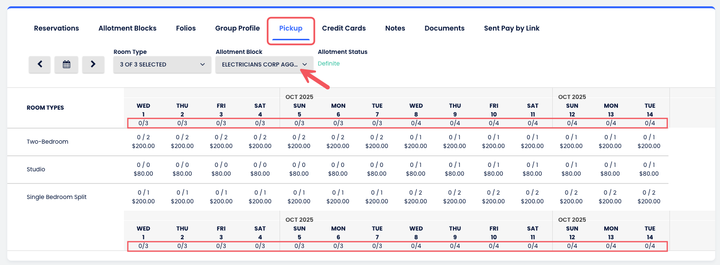 Toplu Kontenjan Bloğunu seçtiğinde, Pickup sayıları gruptaki tüm bloklar arasındaki toplam bloklanmış odalar ve rezervasyonları gösterir. Bu, müsaitlik ve performansın genel bir görünümünü sağlar.