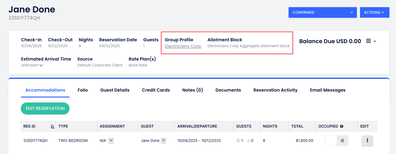 • Rezervasyon oluşturma – Yeni bir rezervasyona başladığında, Grup Profili bu özellik etkinleştirilerek oluşturulduysa, Kontenjan Bloğu açılır menüsünde her zaman Kontenjan Bloğu Toplamı görünür.