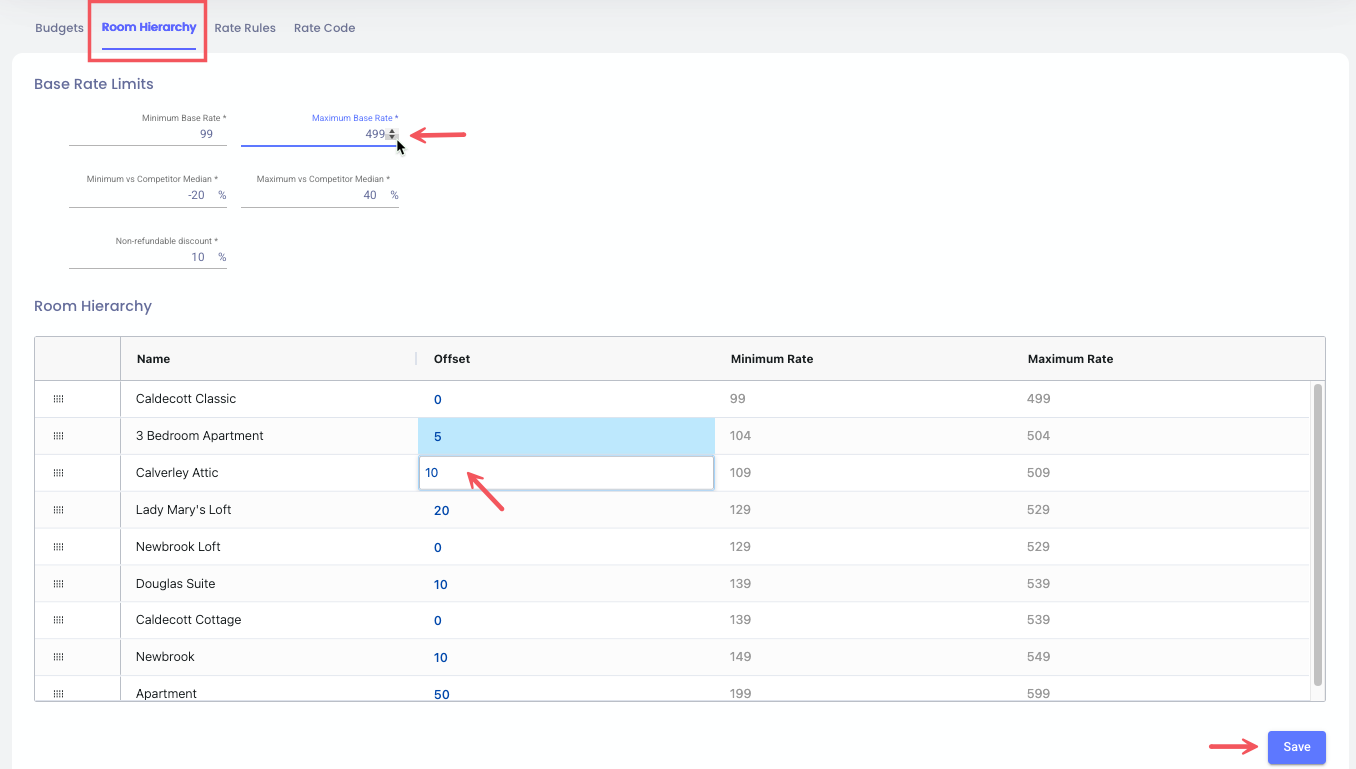 Oda Hiyerarşisi bölümü, tesisin için fiyat koruma sınırlarını kontrol etmeni sağlar. Bu, hem Taban Fiyat Limitleri hem de oda tipine göre ayarlamaları içerir.