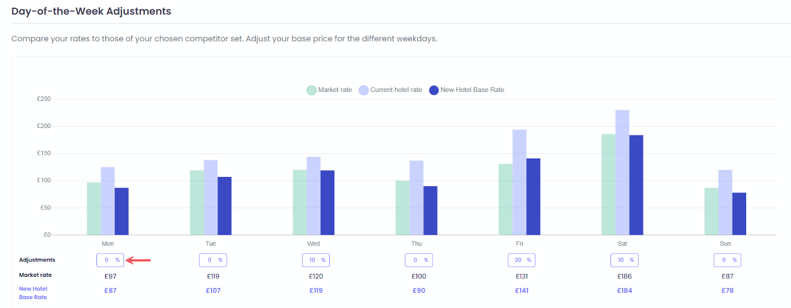 Tabanı ayarladıktan sonra, haftanın günlerine göre ince ayar yap. Grafik, piyasa fiyatını (yeşil), senin mevcut tesis fiyatını (açık mavi) ve yeni tesis taban fiyatını (koyu mavi) karşılaştırır. Normal hafta içi desenlerine uyum sağlamak için gün başına % Düzeltmeler (-%75 ile %100 arası) gir.