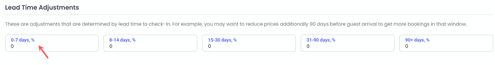 İsteğe bağlı olarak rezervasyon penceresine göre ince ayar yap (örn. 0–7, 8–14, 15–30, 31–90, 90+ gün). Çoğu durumda, bunları %0 olarak bırak—AI optimizasyonu rezervasyon penceresi davranışını otomatik olarak yönetir. Sadece belirli strateji rehberliği verildiğinde kullan.