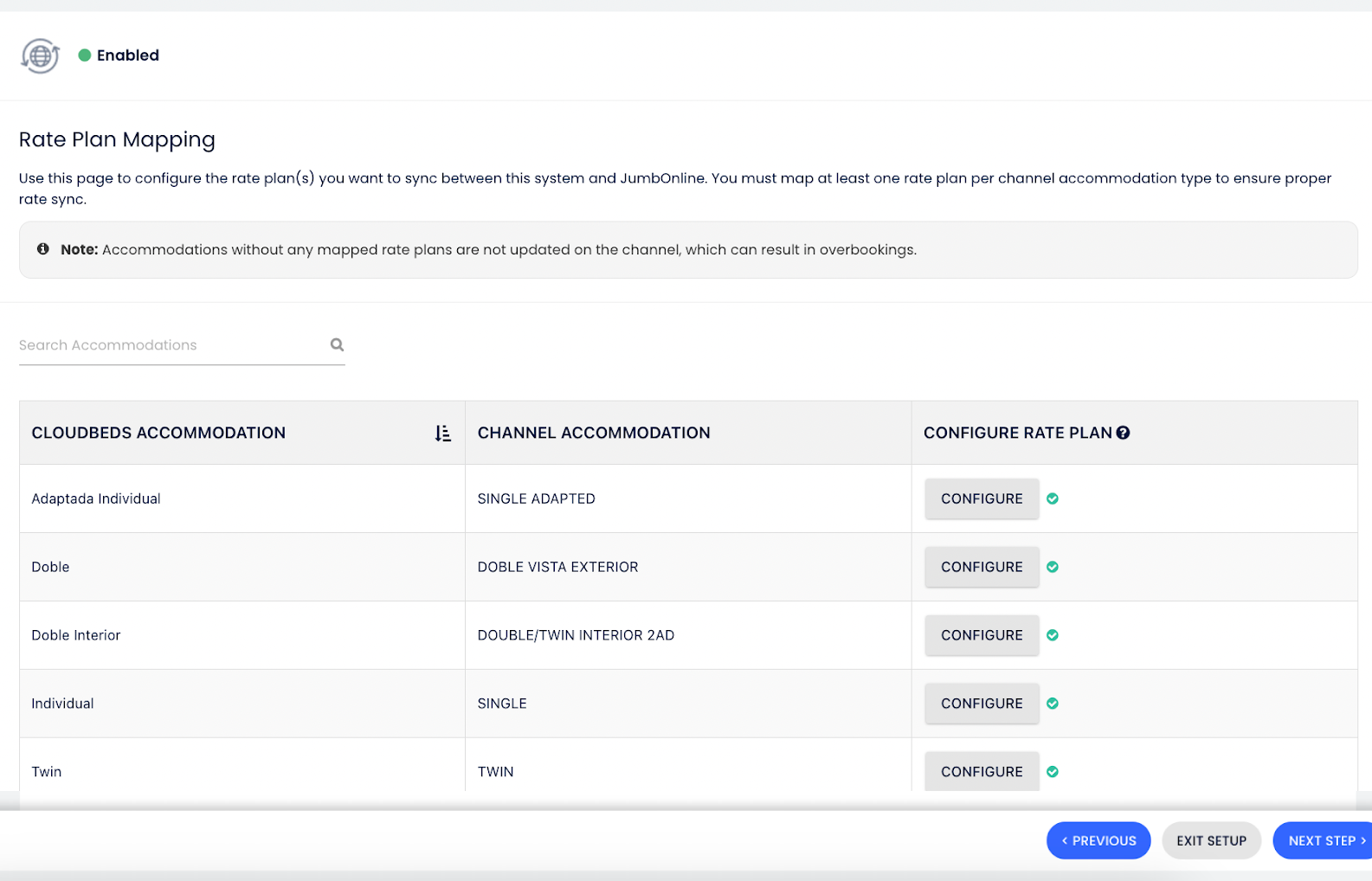 - Fiyat Planı Eşleştirme: Cloudbeds fiyat planlarını JumbOnline fiyat planlarına eşlemek için Yapılandır seçeneğine tıkla. Her oda için en az bir fiyat planı eşleştir.