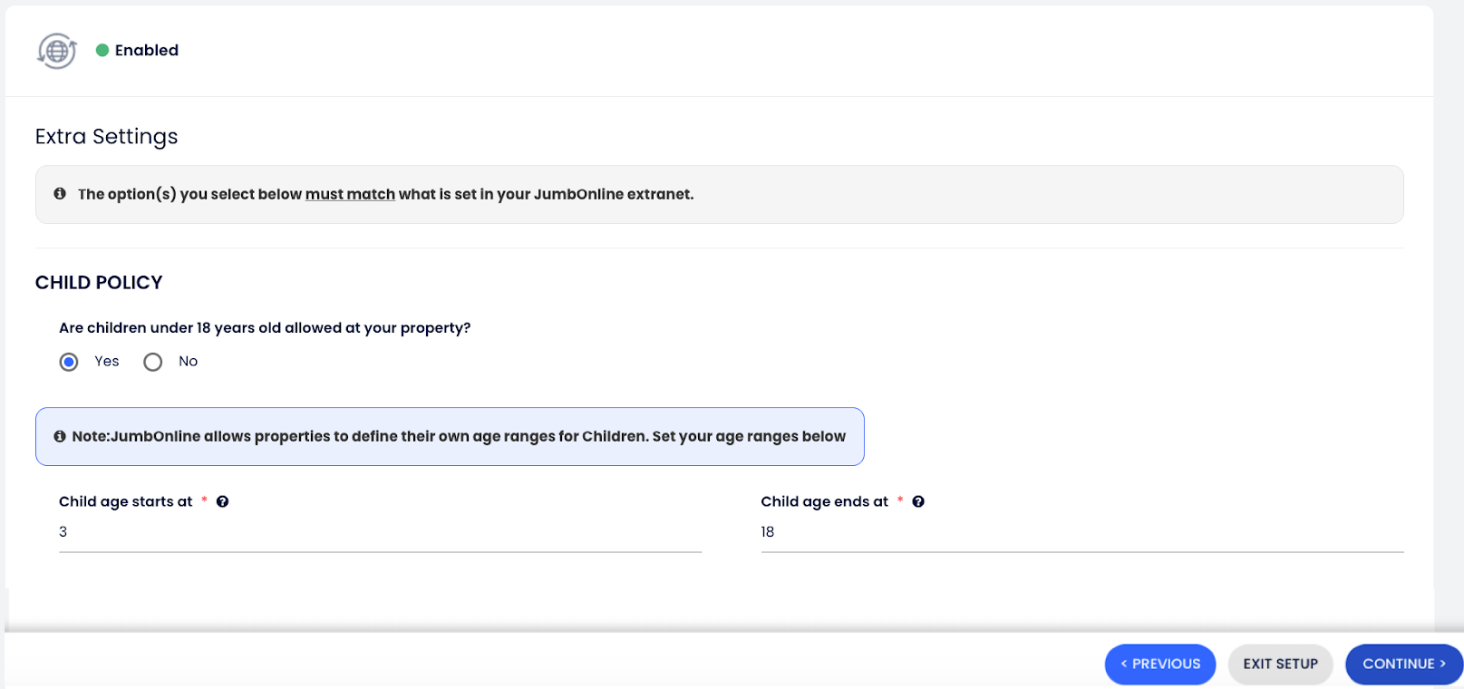 - Ek Ayarlar – Çocuk Politikası: 18 yaş altı çocukların kabul edilip edilmeyeceğini seç ve JumbOnline extranet’ine uygun olacak şekilde çocuk yaş aralığını (başlangıç/bitiş yaşları) ayarla.