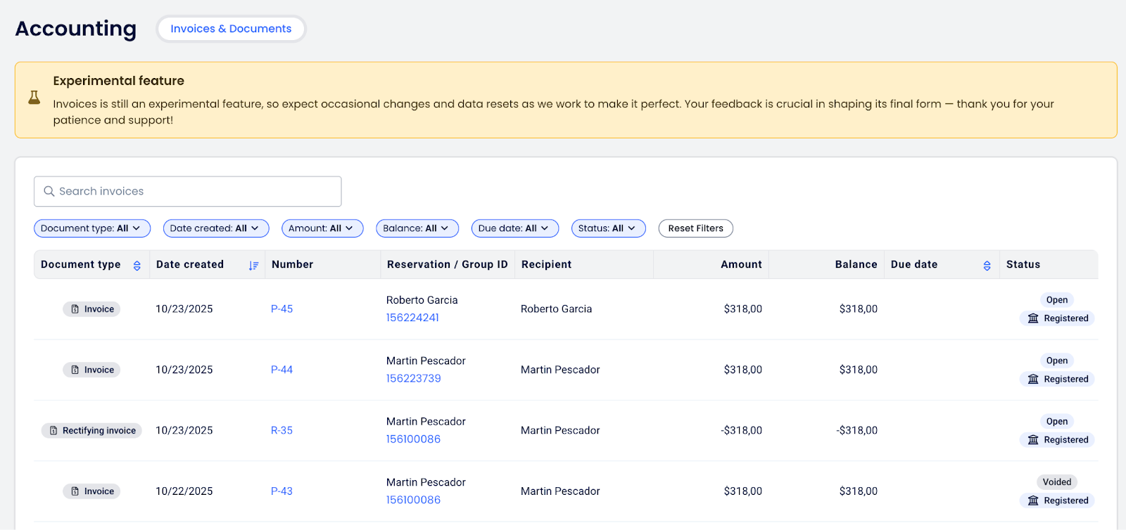 - Bağlandıktan sonra, Cloudbeds içinde doğrudan aşağıdaki uyumlu faturalama işlemlerini yapabilirsin: