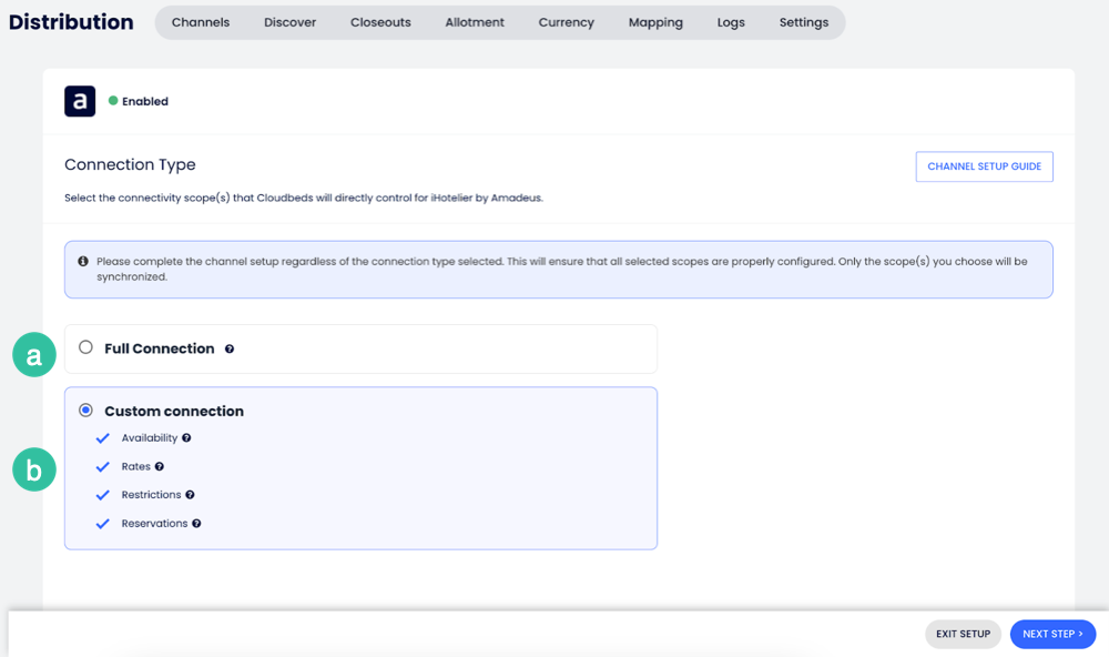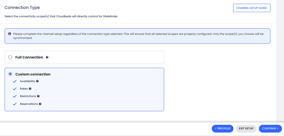 2. Özel bağlantı – Cloudbeds'in hangi kapsamları kontrol edeceğini sen seçersin. Bu, kanalın yeteneklerine bağlı olarak tek yönlü veya kısmi çift yönlü bağlantılara izin verir.