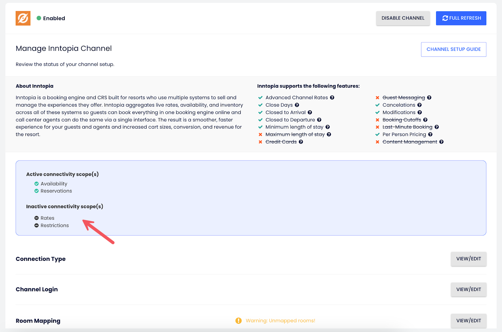 1. Tam Bağlantı – Cloudbeds bu kanal için Müsaitlik, Fiyatlar, Kısıtlamalar ve Rezervasyonlar dahil olmak üzere desteklenen tüm kapsamları yönetir (standart çift yönlü bağlantı).