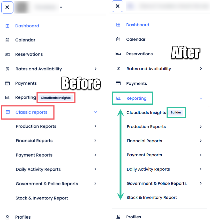 - Önce: Cloudbeds Insights Raporlama altında listelenirken, Klasik Raporlar ayrı bir menü öğesi olarak görünüyordu.