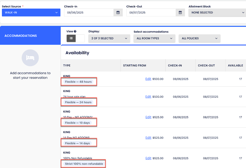 - Rezervasyon yaparken, politika adı her oda/fiyat planı üzerinde gösterilir.