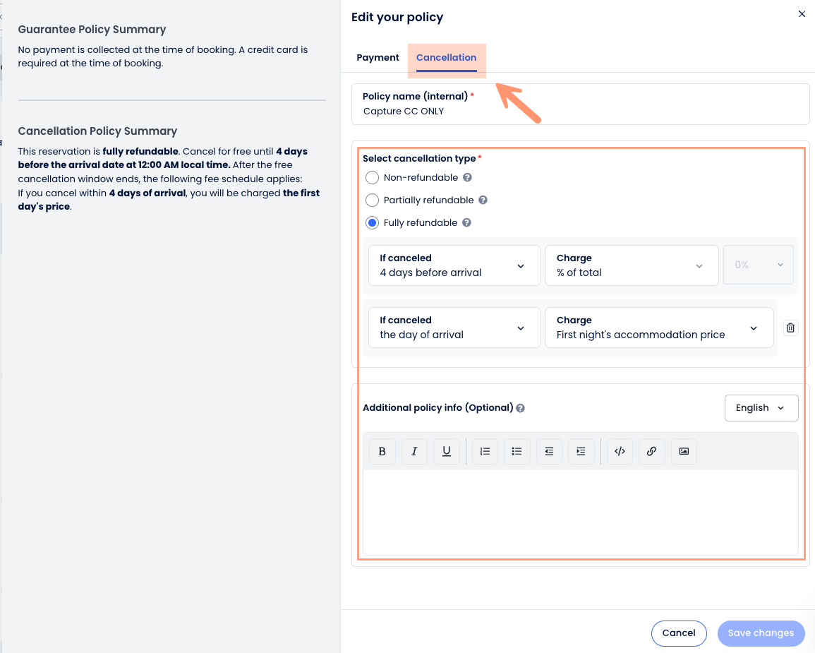 Yeni Cloudbeds Smart Politikalarını yapılandırmanın ilk adımı, çoğu fiyat planında kullanılacak varsayılan İptal politikasını belirlemektir.