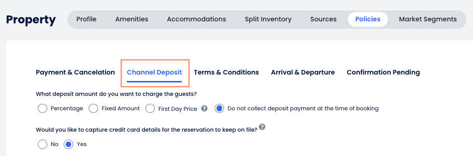 Politikalar sayfasında, önceki ayarlarını koruyan yeni bir Kanal Depozitosu sekmesi bulunmaktadır. Herhangi bir değişiklik yapmana gerek yok, OTA'lar için mevcut ödeme işleme yapılandırmaların aynı kalacaktır.