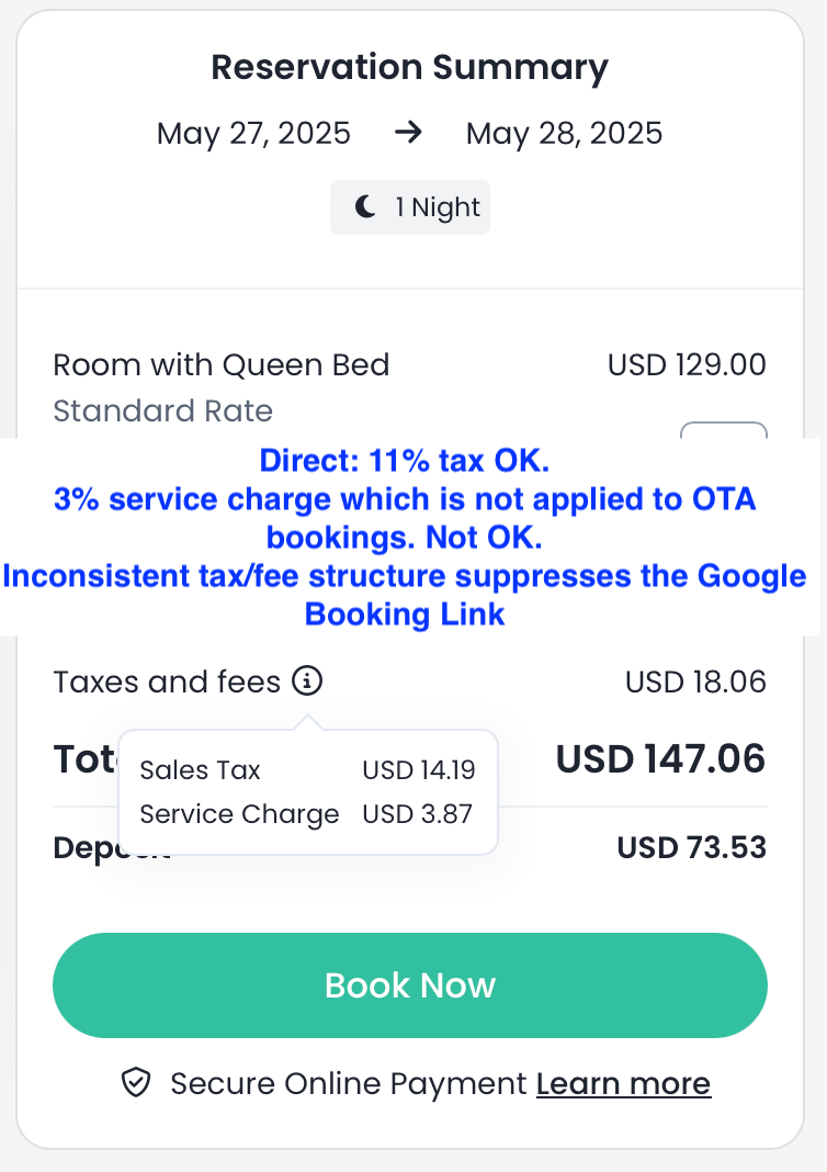 Google, doğrudan rezervasyon fiyatlarınızda hükümet dışı ücretler (örneğin hizmet bedeli) veya OTA’larda (örn. Booking.com) gösterilen fiyatlardan daha yüksek vergiler varsa ABD ve Kanada’da Ücretsiz Rezervasyon Bağlantılarını (FBL) engelleyebilir.