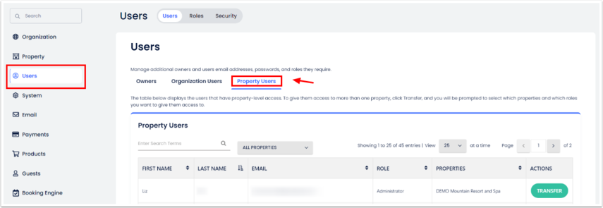 Cloudbeds PMS hesabındaki Kullanıcılar sayfasının Tesis Kullanıcıları sekmesinde tüm tesis düzeyindeki kullanıcıları görebilirsin: