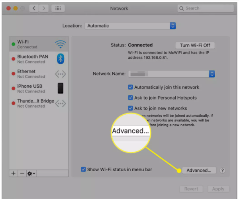 - Wi-Fi bağlantısı ayarlarını değiştirmek için Wi-Fi'yi seç ve Gelişmiş'e tıkla.