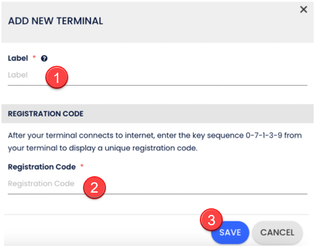 Bir pencere açılacak ve Cloudbeds Payments yapılandırmana bağlı olarak terminal seri numarasını veya benzersiz kayıt kodunu girmen istenecek. Aşağıya bak: