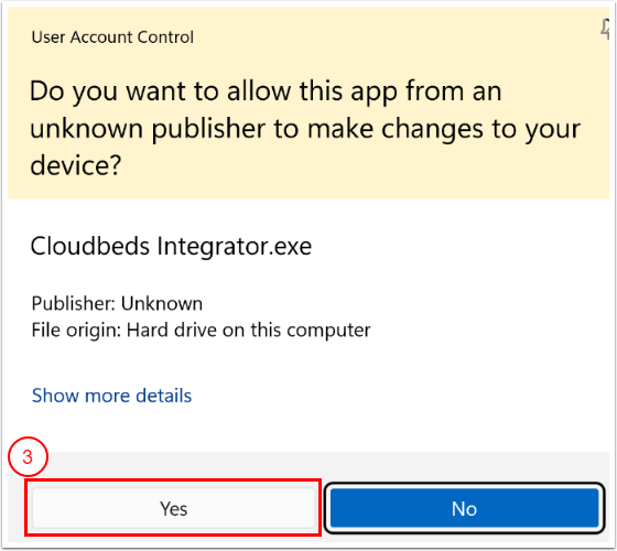 1. Cloudbeds Entegratör uygulamasının bilgisayarınızda çalışmasına izin vermek için Evet tıkla.